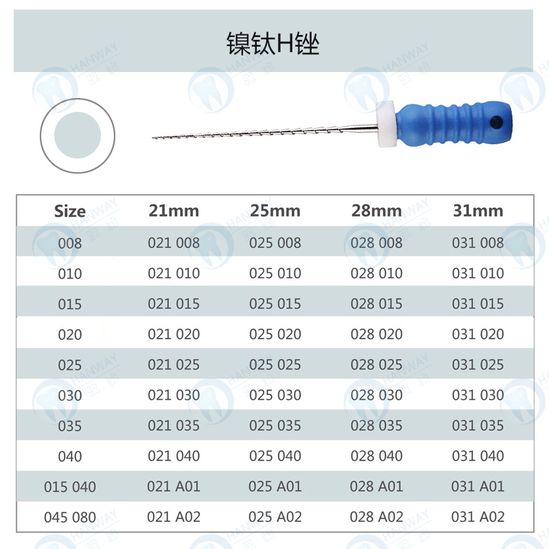 1.镍钛合金材质,具有耐磨性、超弹性等优异特性,普遍适合复杂根管的手动预备